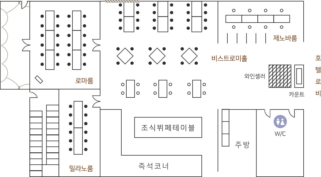 기존의 호텔 레스토랑과의 차별화를 통해 지나친 격식을 갖출 필요없이 자유로운 분위기에서 고품격 요리를 즐길 수 있는 이탈리안 레스토랑
